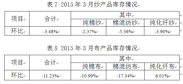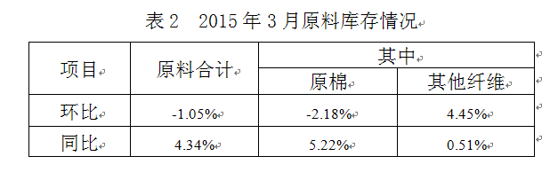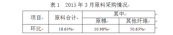 2015年3月與2月相比,工作日明顯增加,棉紡織企業(yè)原料采購增加,庫存減少;紗、布產(chǎn)品產(chǎn)量、銷售量增加,庫存量減少。