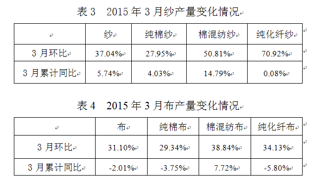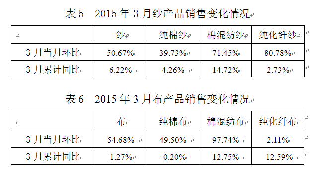 2015年3月交易日多于2月,紗、布銷售量環(huán)比上升;3月份紗、布累計銷售量同比均有所增長,市場略有好轉,訂單有所增加,據(jù)協(xié)會調(diào)研了解部分企業(yè)訂單已到2季度末。