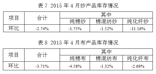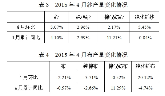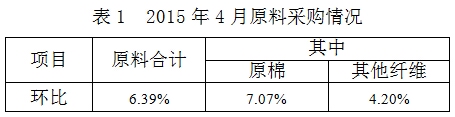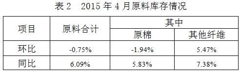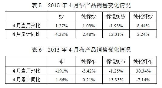 2015年4月與3月相比,棉紡織企業(yè)原料采購增加,庫存減少;紗產(chǎn)品累計產(chǎn)量、銷售量增加,庫存減少;布產(chǎn)品累計產(chǎn)量、銷售量、庫存量均減少。
