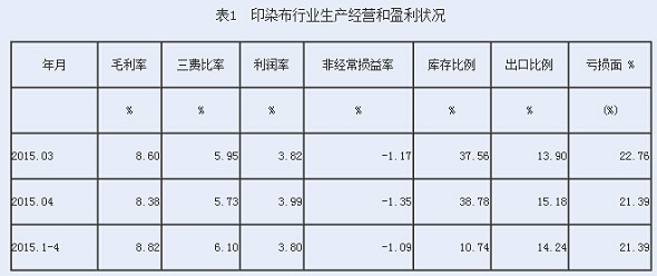 從企業(yè)生產(chǎn)經(jīng)營(yíng)和盈利狀況看,印染布行業(yè)毛利率2015年1-4月份為8.82%,三費(fèi)比率(營(yíng)業(yè)、管理和財(cái)務(wù)費(fèi)用率之和)為6.10%,利潤(rùn)率為3.80%,如果剔除非經(jīng)常性損益的影響,名義稅前利潤(rùn)率為2.71%;該行業(yè)庫(kù)存比率為10.74%,表明產(chǎn)品銷(xiāo)售正常;出口比例為14.24%,表明出口狀況較好;該行業(yè)虧損面為21.39%。由此可見(jiàn),在印染布行業(yè)中,生產(chǎn)經(jīng)營(yíng)狀況運(yùn)作得較好。