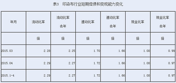 從短期償債和變現(xiàn)能力的變化看,印染布行業(yè)流動(dòng)比率(流動(dòng)資產(chǎn)/流動(dòng)負(fù)債)2015年1-4月份為2.29倍,而上年同期為2.27倍,流動(dòng)比率較高,表明企業(yè)短期償債能力較強(qiáng);