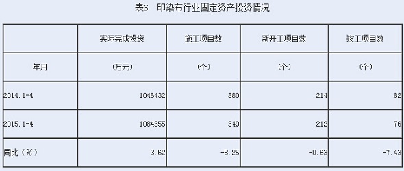 據(jù)報(bào)道,2015年1-4月份印染布行業(yè)實(shí)際完成投資額108.44億元,同比增加3.62%;當(dāng)年以來(lái)到目前為止施工項(xiàng)目總數(shù)為349個(gè),同比減少8.25%;其中新開(kāi)工項(xiàng)目數(shù)212個(gè),同比減少0.63%;截至4月底為止,已實(shí)現(xiàn)竣工項(xiàng)目數(shù)76個(gè),同比減少7.43%,占施工項(xiàng)目總數(shù)的21.77%,表明該行業(yè)投資項(xiàng)目進(jìn)展較好。