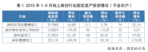 2015年1~5月,中國麻紡織行業(yè)經(jīng)濟(jì)運(yùn)行整體良好,含麻終端產(chǎn)品的出口快速增加,但也出現(xiàn)了投資不均衡的狀態(tài)。