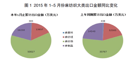 2015年1~5月,我國麻紡織行業(yè)累計出口總額8.03億美元,同比增長27.61%,出口鞏固發(fā)展。