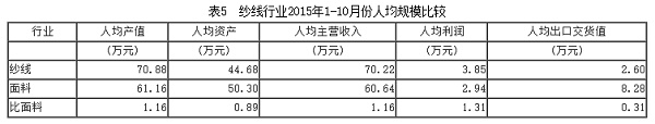 從行業(yè)人均規(guī)模的比較看,2015年1-10月份紗線行業(yè)人均產(chǎn)值為70.88萬元,為面料行業(yè)平均數(shù)的1.16倍;行業(yè)人均資產(chǎn)為44.68萬元,為面料行業(yè)平均數(shù)的0.89倍;行業(yè)人均主營(yíng)收入為70.22萬元,為面料行業(yè)平均數(shù)的1.16倍;行業(yè)人均利潤(rùn)為3.85萬元,為面料行業(yè)平均數(shù)的1.31倍;行業(yè)人均出口交貨值為2.60萬元,為面料行業(yè)平均數(shù)的0.31倍。由此可見,在紗線行業(yè)中,行業(yè)人均規(guī)模略低于面料行業(yè)的平均水平。