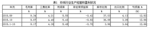 從企業(yè)生產(chǎn)經(jīng)營(yíng)和盈利狀況看,紗線行業(yè)毛利率2015年1-10月份為9.17%,三費(fèi)比率(營(yíng)業(yè)、管理和財(cái)務(wù)費(fèi)用率之和)為4.38%,利潤(rùn)率為5.49%,如果剔除非經(jīng)常性損益的影響,名義稅前利潤(rùn)率為4.78%;該行業(yè)庫存比率為3.96%,表明產(chǎn)品銷售正常;出口比例為3.64%,表明出口狀況較好;該行業(yè)虧損面為12.86%。由此可見,在紗線行業(yè)中,生產(chǎn)經(jīng)營(yíng)狀況運(yùn)作得較好。
