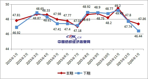 據(jù)中國(guó)·常熟男裝行業(yè)景氣度指數(shù)(圖1)顯示,2016年1月,男裝行業(yè)景氣度指數(shù)繼續(xù)下降,指數(shù)值收于47.36點(diǎn),環(huán)比下降0.44個(gè)百分點(diǎn),同比下降0.45個(gè)百分點(diǎn)。