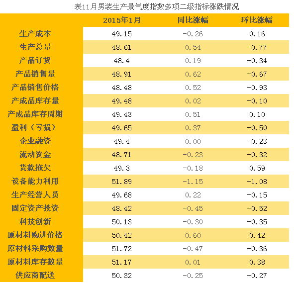 3、1月男裝生產(chǎn)景氣度指數(shù)二級(jí)指標(biāo)情況