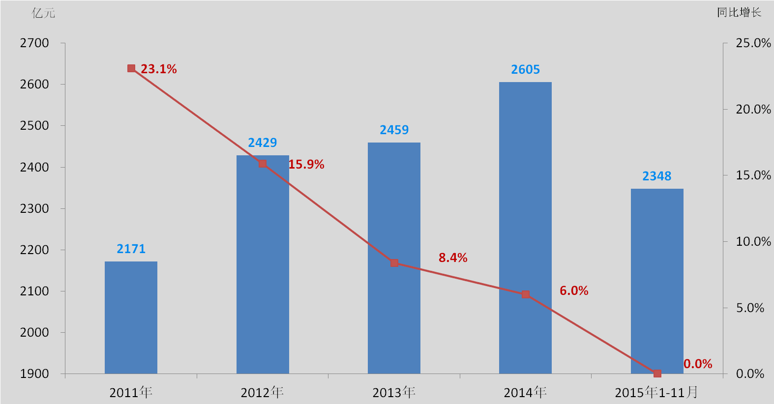 家紡行業(yè)總體運行較為平穩(wěn)。2015年1-11月,國家統(tǒng)計局統(tǒng)計的1850家家紡規(guī)上企業(yè)實現(xiàn)主營業(yè)務收入2348億元,與上年同期持平,增速同比繼續(xù)回落。行業(yè)在國民經(jīng)濟下滑以及市場需求動力不足的前提下,逐漸下滑。
