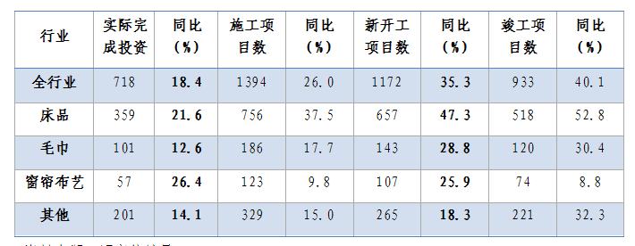 2015年1-11月,國家統(tǒng)計局統(tǒng)計的1850家規(guī)上企業(yè)實際完成投資同比增長18.4%。其中,窗簾布藝企業(yè)完成實際投資最好,同比增長26.4%;床品增速次之,同比增長21.6%;毛巾類企業(yè)增長相對較慢,同比增長12.6%。行業(yè)新開工項目數(shù)1172個,同比增長35.3%,增長平穩(wěn)。