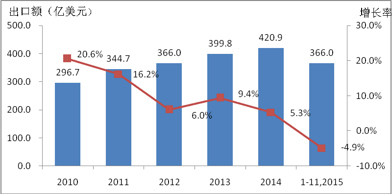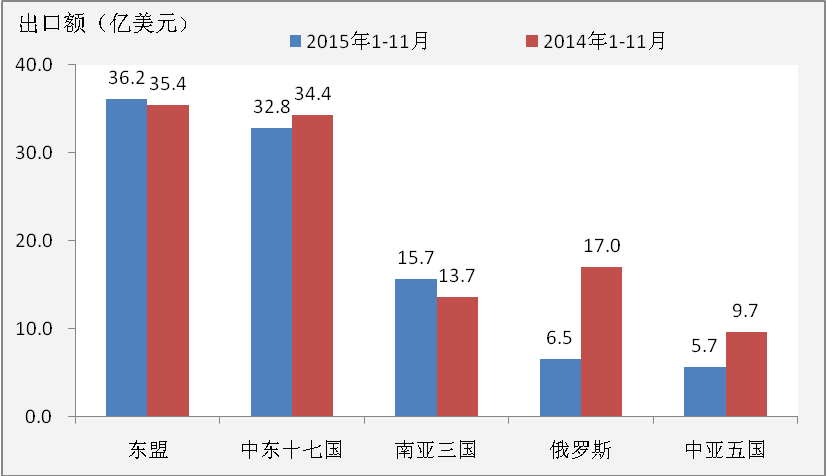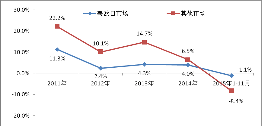 2015年1-11月,我國對傳統(tǒng)三大市場以外的其他國家和地區(qū)累計出口183億美元,同比下降8.4%。