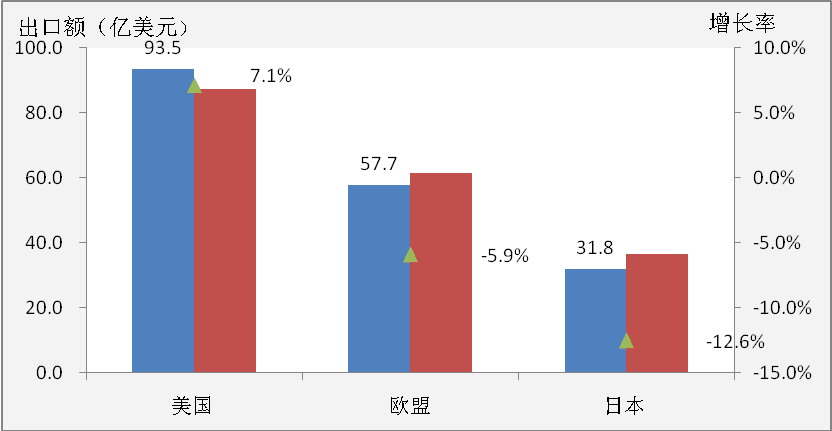 2015年1-11月家紡產(chǎn)品出口美歐日情況(資料來源:中國海關總署)