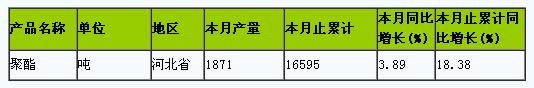 2013年1-9月,河北省聚酯產(chǎn)量為16595噸,同比增長(zhǎng)18.38%。