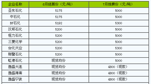 國內(nèi)部分PTA工廠7月掛牌價(jià)統(tǒng)計(jì)