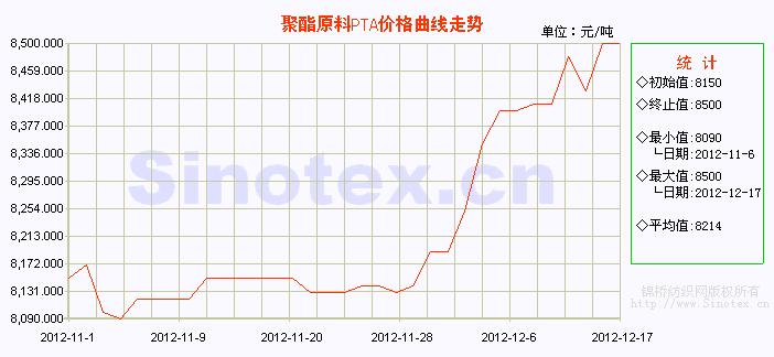 近期PX-PTA-PET整個聚酯產(chǎn)業(yè)鏈的行情均處在堅挺向上的局面中,但是漲勢最快的產(chǎn)品仍屬PX。從各類產(chǎn)品的價格走勢來看,11月份除了PX行情有小幅拉漲外,其余產(chǎn)品行情基本以維穩(wěn)為主,但是進入12月份以來,隨著PX行情的大幅拉漲,PTA以及切片行情也踴躍而上,目前亞洲PX市場行情已經(jīng)成功沖高至1634美元/噸,較月初上漲了近5.56%,接近年內(nèi)最高點;PTA內(nèi)盤商談價格漲至8450元/噸,較月初相比,漲幅達3.68%,聚酯切片價格漲至10250元/噸,漲幅為3.01%。