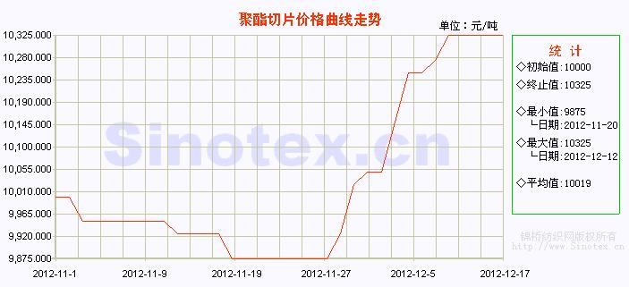 (數(shù)據(jù)來源:錦橋紡織網(wǎng)曲線欄目) 雖然每年的12月是傳統(tǒng)的需求淡季,但是高成本拉漲了疲軟的聚酯行情。目前多數(shù)廠家將12月份合同貨報價上調(diào),其中,珠海BP 、恒力石化將12月PTA合同報價上調(diào)至8800元/噸,較之前上調(diào)200元/噸。恒逸石化12月聚酯切片合同報價上調(diào):半光、民用有光、薄膜級、工業(yè)絲級切片均為10600元/噸,較之前上漲300元/噸。