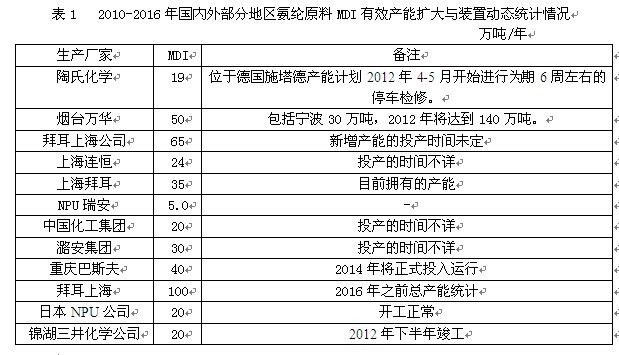 最近幾年內(nèi),全球MDI擴產(chǎn)節(jié)奏也將放緩,未來2015年以后,中國地區(qū)MDI擴產(chǎn)節(jié)奏將出現(xiàn)放緩態(tài)勢,供需情況將得到一定的改善,行業(yè)周期繼續(xù)呈現(xiàn)向上態(tài)勢。國內(nèi)地區(qū)產(chǎn)能還將出現(xiàn)增長的態(tài)勢,山東煙臺萬華公司后續(xù)還將技改擴建為60萬噸,預(yù)計2012年萬華MDI產(chǎn)能將達(dá)到110萬噸,是目前產(chǎn)能的2.2倍。據(jù)悉,巴斯夫重慶40萬噸MDI項目對于國內(nèi)市場也非常的重要,非常值得關(guān)注,根據(jù)規(guī)劃,巴斯夫在重慶長壽區(qū)建設(shè)世界最大的MDI生產(chǎn)基地,年產(chǎn)40萬噸,巴斯夫和重慶市政府計劃2013年實現(xiàn)年產(chǎn)40萬噸MDI生產(chǎn)裝置的機械竣工,2014年將正式投入商業(yè)運營。還有德國拜耳(Bayer)2010年底表示將投資約10億歐元(13.3億美元)擴大其在中國上海的MDI和聚碳酸酯的產(chǎn)能以更為深入地聚焦亞太市場。公司稱關(guān)于所涉五大生產(chǎn)項目的合作備忘錄已與有關(guān)部門簽訂完成。該五大生產(chǎn)項目計劃與拜耳技術(shù)服務(wù)(BayerTechnologyServices)合作,目的在于提高公司在上?;瘜W(xué)工業(yè)區(qū)的產(chǎn)能,工程實施后,公司在該地的MDI及高性能聚碳酸酯產(chǎn)能將在2016年結(jié)束前分別擴增1倍以上至100萬噸/年和50萬噸/年。根據(jù)預(yù)測,未來兩年內(nèi)全球MDI需求增速大于供給增速,行業(yè)將進(jìn)入2-3年的景氣周期。除煙臺萬華外,在2013年之前全球基本沒有可以確定的新產(chǎn)能投產(chǎn),煙臺萬華公司新增的30萬噸產(chǎn)能預(yù)計在2011年將完全釋放。2012年以后,煙臺萬華除了可以能將國內(nèi)地區(qū)市場價格進(jìn)行提升推動外,煙臺萬華后續(xù)在產(chǎn)能投放上也有較好預(yù)期。煙臺萬華現(xiàn)有MDI產(chǎn)能80萬噸,其中包括在煙臺20萬噸,寧波一期30萬噸,寧波二期也是30萬噸。2012年將是寧波三期工程投產(chǎn)的時期,寧波三期整體為60萬噸裝置,2012年上半年將投產(chǎn)30萬噸,到年底再投產(chǎn)30萬噸。至2012年底,煙臺萬華達(dá)到140萬噸的產(chǎn)能。對于全球600余萬噸的產(chǎn)能而言,30萬噸的供給增長,相當(dāng)于未來3年產(chǎn)能的復(fù)合增長率僅為1.7%。另外,拜耳集團CEO戴克斯博士2011年11月16日在拜耳上海一體化基地10周年慶典上表示,拜耳計劃將基地內(nèi)的MDI產(chǎn)能至100萬噸/每年。公司計劃在一期投資的基礎(chǔ)上追加二期投資該項投資預(yù)計10億歐元,擴產(chǎn)內(nèi)容包括增加其MDI產(chǎn)能到100萬噸/年,聚碳酸酯產(chǎn)能到50萬噸/年,并建立一條全新的HDI生產(chǎn)線,將其年產(chǎn)能提高5萬噸。目前拜耳已在這個生產(chǎn)基地投資21億歐元用于生產(chǎn)其主要產(chǎn)品。拜耳上海公司一體化基地目前擁有MDI產(chǎn)能35萬噸,HDI產(chǎn)能3萬噸。戴克斯博士透露,新設(shè)施都將采用最先進(jìn)的技術(shù),大規(guī)模資金的投入意味著拜耳對中國以及亞洲市場的信心。還有來自國外的消息稱,錦湖三井麗水MDI擴建項目2012年完工,錦湖三井化學(xué)公司表示,公司位于麗水的MDI產(chǎn)能擴建項目預(yù)計2012年下半年竣工。錦湖三井此次裝置擴產(chǎn)后,在韓國的MDI產(chǎn)能將由原來的15萬噸擴大至20萬噸,公司將投入3500億韓元擴建該裝置。裝置建成后,產(chǎn)品將可以滿足海外客戶的需求。錦湖三井公司人員表示,韓國和中國等亞洲地區(qū)對汽車和消費產(chǎn)品的快速發(fā)展,使得市場對MDI及聚氨酯產(chǎn)品的需求量增大。目前公司生產(chǎn)的MDI多用于汽車內(nèi)飾、冰箱保溫、建材等各個領(lǐng)域。下表1為2010-2016年國內(nèi)外部分地區(qū)氨綸原料MDI有效產(chǎn)能擴大與裝置動態(tài)統(tǒng)計情況