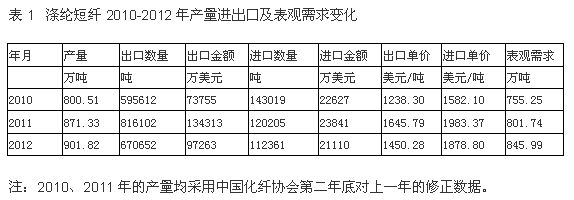 據(jù)國家統(tǒng)計(jì)局和中國海關(guān)公布的數(shù)據(jù),我國滌綸短纖產(chǎn)量從2010年800.51萬噸,改變至2012年901.82萬噸,增加12.66%;出口數(shù)量從59.56萬噸改變至67.07萬噸,增加12.60%;進(jìn)口數(shù)量從14.30萬噸改變至11.24萬噸,減少21.44%;表觀需求從755.25萬噸改變至845.99萬噸,增加12.01%;表明我國滌綸短纖出口高于進(jìn)口,產(chǎn)量除了滿足國內(nèi)市場旺盛的需求之外,還極大地滿足了國際市場的需求。