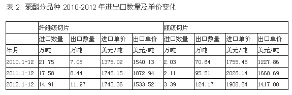 從聚酯分品種的進出口變化情況看,纖維級聚酯進口數量從2010年的21.75萬噸改變至2012年的14.91萬噸,減少31.44%;出口數量從7.08萬噸改變至11.97萬噸,增加68.97%;進口單價從1375.02美元/噸改變至1743.4美元/噸,增加26.79%;出口單價從1540.1美元/噸改變至1533.5美元/噸,減少0.43%;表明纖維級聚酯進出口數量有所變化,進出口單價有所波動。