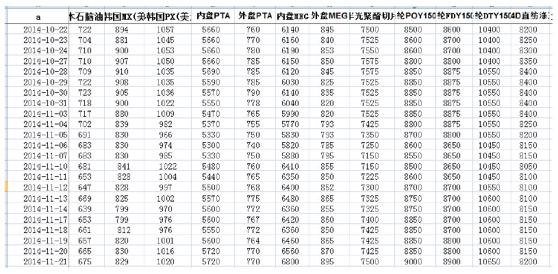 3、截止到11月21日,由CCFEI中纖價格指數(shù)測得11月前15個交易日PTA現(xiàn)貨市場內(nèi)盤成交均價為5501.3元現(xiàn)款。