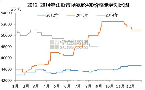 由圖1所示,去年氨綸整體市場持續(xù)上行,9、10月份傳統(tǒng)需求旺季期間以40D為代表的氨綸價格達到年內(nèi)最高,成交價格約52500元/噸。2014年年后歸來,氨綸市場順應(yīng)2013年上行趨勢,年初價格相對高位,但因下游需求不及預(yù)期,以及行業(yè)庫存水平高位,廠家出貨壓力增加等因素的影響,此后國內(nèi)氨綸市場持續(xù)緩慢下行,主流市場價格跌跌不休。截至7、8月的傳統(tǒng)需求淡季,江浙地區(qū)氨綸40D價格已經(jīng)跌至年后最低,當前約為48000元/噸,較年初下跌了5.88%。
