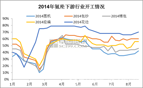 據(jù)悉,氨綸行業(yè)的主要消費終端為下游織造企業(yè),其中包括圓機、包紗、棉包、經(jīng)編、花邊等行業(yè)。氨綸市場的景氣與否受上述行業(yè)的需求情況影響較大。然而當前來看,下游市場的實質(zhì)需求卻不及2013年般精彩。據(jù)悉,自上半年細旦絲的傳統(tǒng)需求旺季過后,氨綸下游行業(yè)開工負荷震蕩下行,直至8月,圓機行業(yè)開工負荷已經(jīng)跌至3-4成,開工最高的花邊行業(yè)也維持在6成上下(如圖2),整體來看,下游市場對原料氨綸的采購需求無明顯放量。