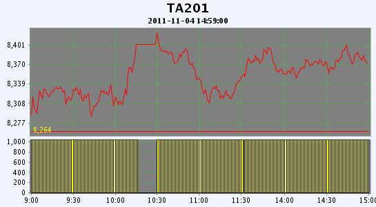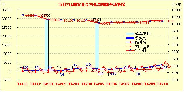 11月4日PTA期貨除首期合約外,高開收漲,成交放量,繼續(xù)增倉。當日總成交183萬手,較昨日增加26.73萬手,成交金額6764.43億元,較昨日增加77.35億元。當日增倉5.79萬手,倉單總量增至45.69萬手。各合約成交均價8355元/噸,+90元。其中首期合約8324元/噸,-100元;TA201合約8350元,+86元;主力TA205合約8382元,+112元。當日公布的首期合約交割價8652元/噸,-30元。