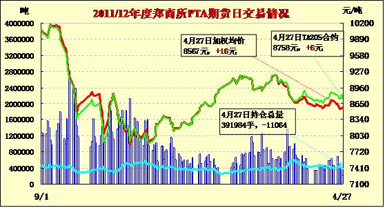 PTA期貨高開回落減倉微漲(12-4-27)