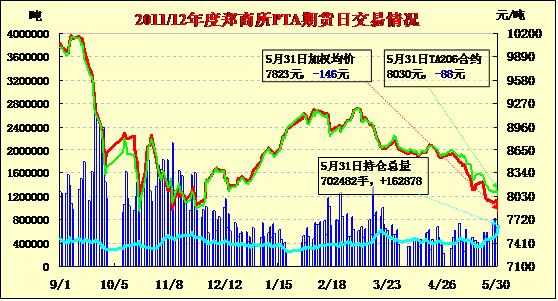 今天是5月份最后一個交易日,PTA期貨巨量增倉跳空下挫,多頭日內(nèi)苦苦在7800筑起的防線最終在最后半小時徹底崩潰,PTA期價擊破7800,收于7772元/噸,以2.48%的跌幅領(lǐng)跌商品期貨。5月跌幅達到9.23%,黑5月在PTA期貨行情上演繹的淋漓盡致。周四PTA期貨行情最引人注目的不是下跌幅度,而是PTA期貨的持倉量。從早盤一開始,多空雙方不斷增倉,截止收盤PTA期貨總持倉達到70.24萬手,再創(chuàng)歷史新高。今年春節(jié)后到5月的PTA基本面是清晰的,那就是利空。拋開宏觀面利空不談?;久嫔辖K端紡織內(nèi)外需求持續(xù)萎縮,傳統(tǒng)旺季行情一再落空,企業(yè)訂單匱乏,虧損擴大??椩扉_機率不斷走低,目前只有60%,堪比2008年金融危機發(fā)生時,但持續(xù)時間比2008年還長。聚酯行業(yè)虧損加劇,負(fù)荷下調(diào),PTA市場需求明顯下滑。PTA行業(yè)巨大的新產(chǎn)能釋放壓力始終壓在市場上空。從基本面來看,PTA多頭無任何利好消息可以倚重,抵抗只能加劇虧損程度。