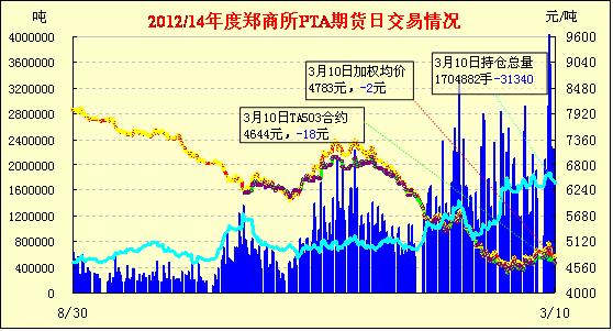 PTA期貨沖高回落減倉續(xù)跌(03-10)