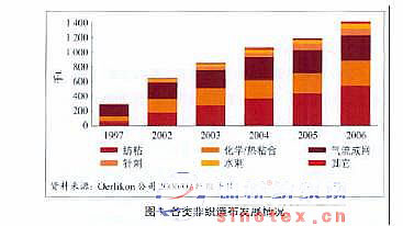 同時, 汽車內(nèi)紡織品和過濾產(chǎn)品的新需求正在全球范圍內(nèi)觸發(fā)新的投資熱潮, 新增的大量紡粘生產(chǎn)線為這一板塊的持續(xù)增長提供了支持, 但全球范圍內(nèi)大規(guī)模的紡絲成網(wǎng)非織造布的規(guī)模擴(kuò)展導(dǎo)致了利用率降低, 幸好對更新舊設(shè)備的日益重視已經(jīng)緩解了這個生產(chǎn)能力過剩的問題;2006年氣流成網(wǎng)非織造布的產(chǎn)量進(jìn)一步提高到了45萬t,主要是濕紙巾和衛(wèi)生用品市場、 女性用品以及食品工業(yè)所用的吸濕墊方面的應(yīng)用引領(lǐng)了行業(yè)的增長, 但生產(chǎn)濕紙巾的技術(shù)已經(jīng)傾向于紡絲成網(wǎng)、 梳理成網(wǎng)和水刺技術(shù)結(jié)合的生產(chǎn)線,同時由于合并和收購,生產(chǎn)高品質(zhì)一次性濕紙巾的廠商數(shù)量不斷減少;2006年高度集中的干法成網(wǎng)板塊的投資很少, 這一行業(yè)的主要生產(chǎn)商是Ahlstrom Corporation和Hollingworth & Vose(H & V)公司,占世界產(chǎn)量的一半左右,全球總產(chǎn)量小幅上漲到22.5萬t左右,主要產(chǎn)品有茶葉袋和過濾材料、醫(yī)用防護(hù)材料、特種濕紙巾、蓄電視隔板和一些其他小規(guī)模的應(yīng)用。