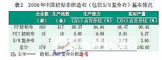 濕法非織造布在我國規(guī)模較小, 2006年略有增長,產(chǎn)量約為1.5萬t,比2005年增長15 %。
