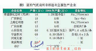 漿粕氣流成網(wǎng)非織造布工業(yè)也不甘落后, 2006年又有新的進(jìn)展,特別是廣東和福建又有一些新的生產(chǎn)線增加。目前全國的漿粕氣流成網(wǎng)生產(chǎn)線已超過40條, 其中不乏一些較大規(guī)模的生產(chǎn)企業(yè)(表5)。