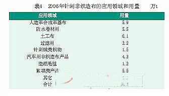 2006年我國針刺非織造布工業(yè)取得了新的發(fā)展, 除了傳統(tǒng)的一些應(yīng)用領(lǐng)域外,在合成革基布、過濾材料、針刺絨類織物、汽車用紡織品等方面發(fā)展更為迅速(表4)。