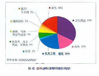 在全球范圍內(nèi)的終端市場方面, 醫(yī)療衛(wèi)生領(lǐng)域是非織造布產(chǎn)品的最大市場, 占據(jù)33 %的份額, 其次是民用工程