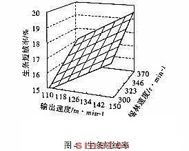 3.3 錫林轉(zhuǎn)速、輸出速度與生條短絨率梳理場(chǎng)強(qiáng)度及分布的增強(qiáng)會(huì)使生條短絨率增加。因此,一般生產(chǎn)中增強(qiáng)梳理場(chǎng)強(qiáng)度的措施如提高梳理機(jī)件的轉(zhuǎn)速,減小梳理機(jī)件間隔距等都會(huì)使生條短絨率增大。雖然梳棉機(jī)的主要任務(wù)是梳理,梳理過程造成纖維損傷不可避免,但對(duì)于一定的喂入棉層結(jié)構(gòu)和一定的纖維物理特性,存在著一定的梳理場(chǎng)強(qiáng)度布置的上限。有資料指出,使用陸地棉(中絨棉)時(shí)刺輥速度在歐洲以950r/min以上是禁區(qū),因?yàn)?50r/min以上時(shí)纖維損傷嚴(yán)重,棉結(jié)增加,由此推知錫林速度也存在這種上限。