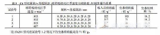 ![]() 從表3可見,錫林蓋板隔距(入口~出口)從0.35mm,0.30mm,0.25mm,0.25mm,0.25mm改變到0.7mm,0.25mm,0.2mm,0.2mm,0.2mm,可以在生條短絨率不變的情況下,使生條棉結(jié)數(shù)降低到FA201型梳棉機(jī)生條棉結(jié)數(shù)的水平。這一隔距的改變相當(dāng)于工作區(qū)蓋板根數(shù)減少,其入口隔距轉(zhuǎn)移到原入口第2點(diǎn),且該點(diǎn)隔距大大減小,而其他3點(diǎn)隔距減小很少。從梳理場(chǎng)布置來看,梳理場(chǎng)分布縮減1/5,入口強(qiáng)度明顯增加,其余部分強(qiáng)度稍有增強(qiáng)。因此,其對(duì)棉結(jié)的減少關(guān)鍵是入口隔距的減小。而從生條短絨率基本不變可知,其梳解棉結(jié)的作用并無明顯增加(因梳理強(qiáng)度有增有減)。筆者認(rèn)為,生條棉結(jié)數(shù)的明顯減少,是由于蓋板倒轉(zhuǎn)時(shí),入口第一點(diǎn)隔距減小而增加了對(duì)棉結(jié)的排除。這些棉結(jié)稍經(jīng)梳理后被排除,減少了因梳解棉結(jié)產(chǎn)生的短絨量,因此,生條棉結(jié)數(shù)明顯減少,而生條短絨率卻不變。