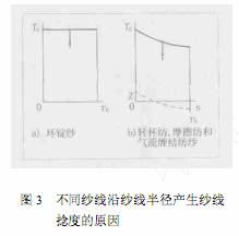 圖3表明在紗線半徑上的捻度產(chǎn)生曲線。在退捻(以及捻度測(cè)試)時(shí),在橫截面具有恒定捻度曲線的環(huán)錠紗和其他紗,保持一條平行移動(dòng)的水平線TG。在TG曲線中,每次沿TG線垂直的移動(dòng),在紗線半徑rG上捻度不恒定。同樣平行地移動(dòng)TG線在各半徑層產(chǎn)生的捻度數(shù)量不同,這導(dǎo)致紗線橫截面不同程度的蓬松和徑向纖維結(jié)構(gòu)的纏結(jié)。在轉(zhuǎn)杯紡過(guò)程,其目的是在紗線橫截面得到恒定的捻度并只加入所需的假捻。