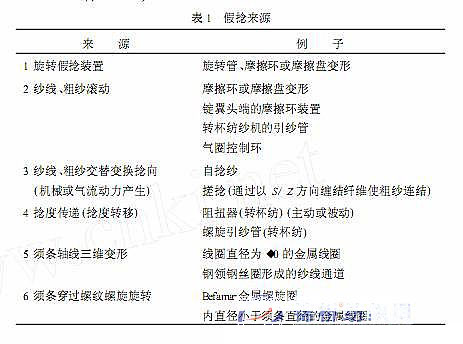 表1列出了假捻的來(lái)源和典型的例子。1~3項(xiàng)為人們所熟知因而不需進(jìn)一步解釋。隨著捻度轉(zhuǎn)移,紗線中的捻度是在現(xiàn)有數(shù)量的基礎(chǔ)上產(chǎn)生附加假捻的先決條件。分析復(fù)雜的公式和試驗(yàn)時(shí),Trommer