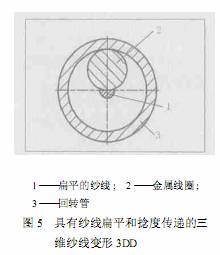 圖4所示假捻裝置的利弊列在一些文獻(xiàn)中,圖5和圖6為旋轉(zhuǎn)管不同的橫截面形狀。圖5表明扁平的三維紗線變形。具有Z捻的金屬線圈在旋轉(zhuǎn)管之前的紗線上產(chǎn)生Z捻,并且以相應(yīng)的方向回轉(zhuǎn)時(shí)也會(huì)產(chǎn)生Z捻。