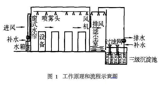 如圖所示,首先利用安裝在生產(chǎn)車間一側(cè)的風(fēng)機(jī)的排風(fēng)作用,在密封的廠房空間內(nèi)形成負(fù)壓。外界的新鮮空氣透過安裝在生產(chǎn)車間另一側(cè)的窗式水簾墻降溫加濕后被吸入廠房形成氣流,該降溫加濕的氣流在穿過生產(chǎn)車間過程中,由不同密度分布的輔助加濕噴霧彌補(bǔ)氣流的濕度,并帶走車間內(nèi)的飛塵。最后,含塵的氣流經(jīng)過濾塵室的噴淋區(qū),除塵后排放到室外,從而達(dá)到通風(fēng)、加濕、調(diào)溫、除塵的目的。