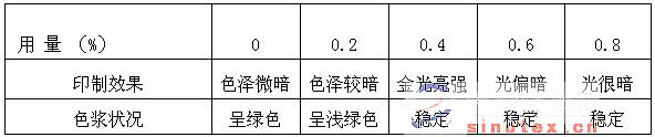 (3)抗氧劑的選擇和用量:金粉印花的亮度除了金粉和粘合劑的選擇和用量控制外,一般應(yīng)在金粉印花色漿中添加抗氧劑,避免金屬粉末在空氣中被氧化而使光澤變暗,抗氧劑可選用苯酚或亞硫酸鈉等,經(jīng)試驗,苯駢三氮唑的抗氧效果最好,因為它為銅的特效緩蝕劑,能與銅生成不溶性混合物,從而對銅起到了保護作用,表3為抗氧劑用量的選擇。