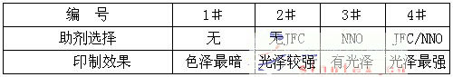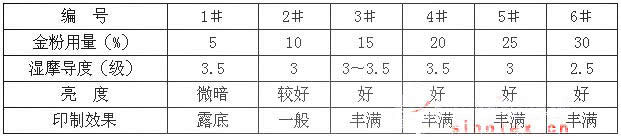 從表2中得知,金粉用量太少時,即要露底,隨著金粉用量的增加印制圖案的金屬光澤也不斷提高,但金粉用量過高,則牢度下降,容易落粉,因此金粉用量應(yīng)在15~25%之間。