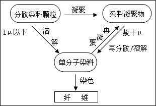 滌綸高溫染色時,染液中的分散染料顆粒的活動過程模式請參閱圖1。