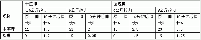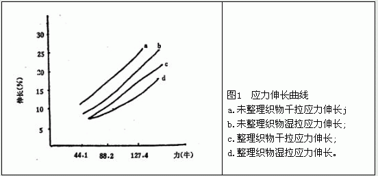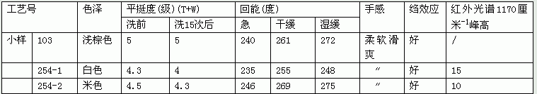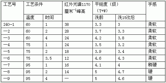 如圖1,拉伸回復(fù)性見(jiàn)表2。 表2 拉伸回復(fù)性 注:以上兩塊織物均為印花成品經(jīng)預(yù)縮后(縮水率為0%)測(cè)得。 從拉伸回復(fù)性的差別以可肯定,交鏈整理后的織物縮水率可以大大地低于不整理織物,但是如若最后一道工序加工張力較大時(shí),織物的縮水率也仍然是很大的,它制約于拉伸回復(fù)率的特征。 四、織物免燙與風(fēng)格之間的矛盾和統(tǒng)一 1·樹(shù)脂用量對(duì)免燙、手感風(fēng)格指標(biāo)的影響 環(huán)氧化合物與真絲雙縐在特定的條件下可發(fā)生交鏈反應(yīng),并能賦予織物以免燙性能,主要是由于環(huán)氧化合物與酪氨酸的酚羥基反應(yīng)的結(jié)果[10],其它也還有賴(lài)氨酸、精氨酸、組氨酸和絲氨酸參與反應(yīng)的可能性。在試驗(yàn)中我們發(fā)現(xiàn),樹(shù)脂的用量不同對(duì)免燙、手感風(fēng)格有重要影響,見(jiàn)表3。 表3 樹(shù)脂用量不同對(duì)免燙、手感鳳格的影響 注;以上均為半制品數(shù)據(jù),手感指標(biāo)為手的直觀(guān)感覺(jué)。 從表中看出,樹(shù)脂用量愈高,免燙性、耐洗性愈好,但與干、濕回能不成規(guī)律,手感風(fēng)格則有下降。 2·工藝條件對(duì)免燙、手感風(fēng)格的影響 環(huán)氧化合物與真絲雙縐的反應(yīng)在不同的時(shí)間、溫度下,可取得不同的整理效果,見(jiàn)表4。 表4 時(shí)間、溫度對(duì)免燙手感、風(fēng)格的影響 注;平挺度為半制品數(shù)據(jù)。 采用紅外光譜檢驗(yàn)免燙效果的方法在后面我們將詳細(xì)論述,在此我們僅以1170厘米-1波峰的大小(即酪氨酸的交鏈情況,從0-70值小為好)來(lái)衡量交鏈度的好壞。從表中看出,經(jīng)75℃、3.5小時(shí)處理的織物的免燙性、交鏈度和手感都很好,而95℃、1~4小時(shí)處理,雖然免燙與交鏈效果甚好,但手感欠佳。 3·織物張力大小對(duì)免燙、手感風(fēng)格的影響 在選出最佳濃度、溫度、時(shí)間后,我們發(fā)現(xiàn)處理時(shí)的織物張力對(duì)免燙、手感風(fēng)格、縐效應(yīng)的指標(biāo)平衡起著至關(guān)重要的作用。我們?cè)诖髽又性捎每椢锝垬?shù)脂工作液后上卷汽蒸,由于工業(yè)化生產(chǎn),進(jìn)布時(shí)張力一般都比小樣大一些??椢镫m然也是在濕狀態(tài)下與環(huán)氧化合物反應(yīng),但卻是在緊張狀態(tài)下的濕交鏈。翻理后織物很難回復(fù)原先的自然狀態(tài),真絲雙經(jīng)的縐效應(yīng)很難保證。嚴(yán)重的是,即使真絲雙絕能夠達(dá)到防縮免燙的要求,如果雙給的特色有所損害,就會(huì)失去實(shí)用價(jià)值。 4·不同工藝方法對(duì)織物免燙、手感風(fēng)格的影響 在研究過(guò)程中。我們選擇的工藝流程是;煉白綢軋膨化劑或催化劑→烘干→浸環(huán)氧樹(shù)脂工作液汽蒸→水洗→烘干→染色或印花→添加劑整理,其中先后試用過(guò)三種整理工藝方法, (1)浸泡法: 浸泡法是先將織物軋膨化劑,烘干打卷后浸入用溶劑烯釋的樹(shù)脂液中,濕反應(yīng)2-4小時(shí)而后染色印花。整理效果見(jiàn)表5。 表5 浸泡法工藝效果 但此工藝方法由于樹(shù)脂分布難以均勻,直接印花尚可,染地與染色加工色差、色花比較嚴(yán)重,平挺度指標(biāo)波動(dòng)較大,無(wú)法正常生產(chǎn),因此浸泡法工藝已不采用。 (2)施加器法, 施加器法是先將織物浸軋催化劑,烘干后織物用圓弧刮刀施加器給液,而后上卷汽蒸。這個(gè)工藝方法的試驗(yàn)數(shù)據(jù)見(jiàn)表1、表2。 (3)二浴法, 二浴法是織物浸軋催化劑烘干后,在松式狀態(tài)下上卷,同時(shí)浸漬樹(shù)脂液汽蒸反應(yīng)。這一方法可使織物在自然和松馳狀態(tài)下發(fā)生交鏈,使織物可獲得防縮兔燙的效果,又保證了縐效應(yīng),也使真絲綢雙縐柔軟活潑的風(fēng)格得到了良好的保持。其綜合指標(biāo)見(jiàn)表6。 表6 二浴法工藝效果 |