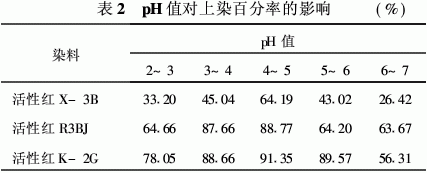 ![]() 由表3可看出,3種染料隨溫度升高,上染百分率均提高。這是因為牛奶蛋白纖維皮層結(jié)構(gòu)緊密,微隙小,染料難以通過。低溫染色時,染料分子很難通過擴散進入到纖維皮層;較高的染色溫度可以促進牛奶蛋白纖維表面皮層軟化膨潤,促進活性染料的吸附、滲透與擴散,提高染料的上染率。X型活性染料在40℃后隨溫度升高上染百分率增大幅度較小,因此選擇40℃比較合適,這與染料的性質(zhì)相對應(yīng)。中溫型活性染料R3BJ在60℃時上染百分率已很高,溫度繼續(xù)升高上染百分率有較小幅度的提高,考慮到染料的性質(zhì)和節(jié)省能源,選擇60℃為佳。隨著染色溫度升高,K型活性染料上染百分率逐步提高。當(dāng)溫度達到90℃時,上染百分率已較高,繼續(xù)升高溫度,上染百分率雖有提高,但幅度不大。王偉華等人曾用差示掃描量熱器分析牛奶蛋白纖維發(fā)現(xiàn):在92·70℃時,纖維有一個大的分解峰。因此,為減少纖維的損傷,K型活性染料對牛奶蛋白纖維的染色溫度以控制在90℃為佳.