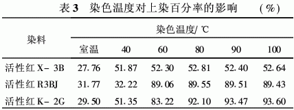 ![]() 由表2可看出,在pH值2~5范圍內(nèi),上染百分率隨染浴pH值升高而增加,在pH值4~7范圍內(nèi),隨染浴pH值降低而增加。牛奶蛋白纖維中含有一定量的蛋白質(zhì)組分,具有與羊毛、蠶絲類似的化學(xué)性質(zhì),因此,在pH值4~7范圍內(nèi),當(dāng)溶液中氫離子數(shù)目增加時,牛奶蛋白纖維所含的氨基正離子數(shù)目增加,通過庫侖力結(jié)合的染料數(shù)量就增加。但當(dāng)pH值降低至4,此時上染百分率反而隨pH值降低而減少,這可能是由于pH值小于4時,染液中大量殘余H+與染料陰離子結(jié)合,使染料所帶負電荷數(shù)減少,屏蔽了部分染料的上染,導(dǎo)致上染百分率有所下降。因此,染液pH值控制在4~5為宜。 2·2 溫度的影響 按照上面討論的各染料最佳pH值,室溫入染,從室溫到100℃升溫,染色60 min。不同染色溫度對染料上染百分率的影響結(jié)果見表3