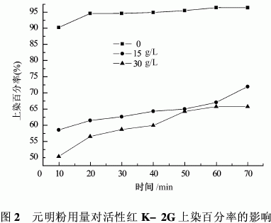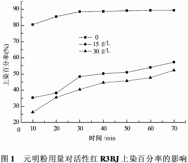 2·4 鹽的影響 纖維室溫入染,染色開始時加入元明粉,按照活性紅R3BJ、活性紅K-2G的最佳染色工藝染色,