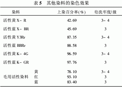 為了了解其他活性染料的染色情況,按照不同類型染料的最佳工藝,在沒有加元明粉的情況下實驗結(jié)果見表5
