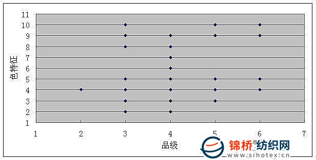圖2 2007年天津市棉花品級與色特征級分布散點(diǎn)圖